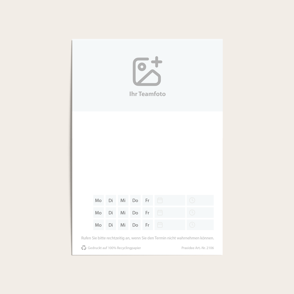 Die „Imago“ Terminzettel verleihen Ihrer Praxis eine ganz persönliche Note, indem sie Ihr Teamfoto integrieren können. Patienten haben so schon bei der Terminvergabe einen vertrauten Eindruck von Ihrem Team.
